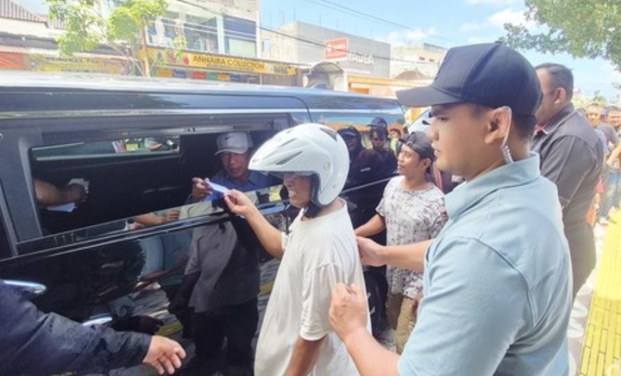 Dari dalam mobil tersebut, Jokowi terlihat menyerahkan langsung paket sembako dan amplop berisi uang kepada warga yang telah berkumpul di pinggir jalan.